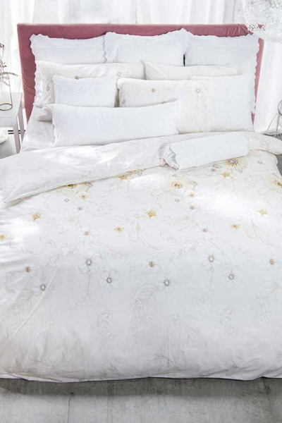 סט מצעים בצבע קרם בהיר עם הדפס פרחים עדינים ולבנים, למיטה מפנקת במיוחד.